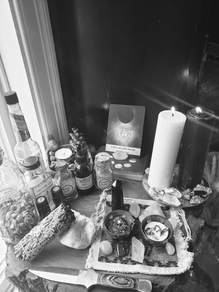 I begin by opening a window to allow the negative energy to be released. Next I dress and prepare the candles. On the white candle I carved the words ‘peace and ‘calm’ because I wish to maintain a peaceful home. Then I place 4 drops of the blessing oil on the white candle and sprinkle on a few rose petals while envisioning a happy and peaceful home. On the black candle, I carve the words ‘cleansing’ and ‘release negativity’ because I wish to remove any stagnant or negative vibes that may be hanging around. Then I place 4 drops of the blessing oil on the black candle and sprinkle on some black salt, as well as casparilla powder, while envisioning the black smoke of negativity leaving my house through the open window. I place the black gemstone next to the black candle to help absorb the negative energy and a quartz crystal near the white candle to aid in peaceful intention.