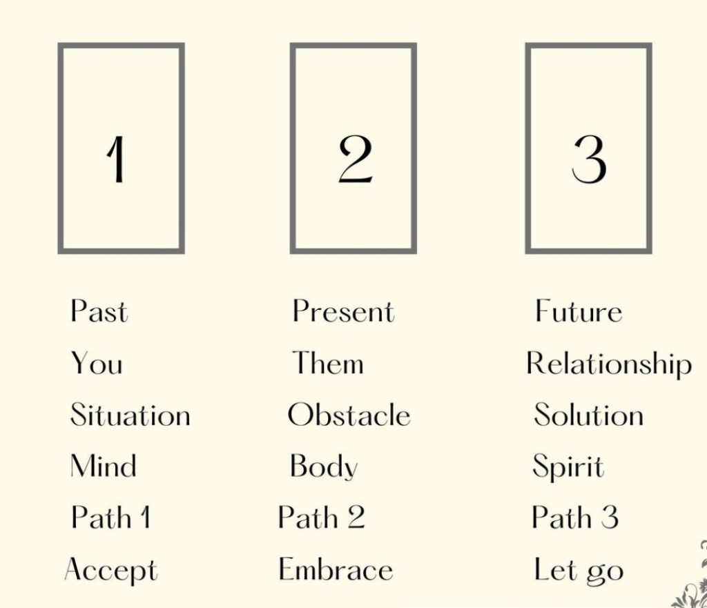As far as tarot spreads, I recommend you stick to the 3 card spreads. Past, present, future is a good one to do consistently. When people are first starting out, I’ve seen them try to do large complicated spreads like a 10 card Celtic spread. It’s much better to start with 2 or 3 card readings until you get used to the cards and know how they relay the messages to you.