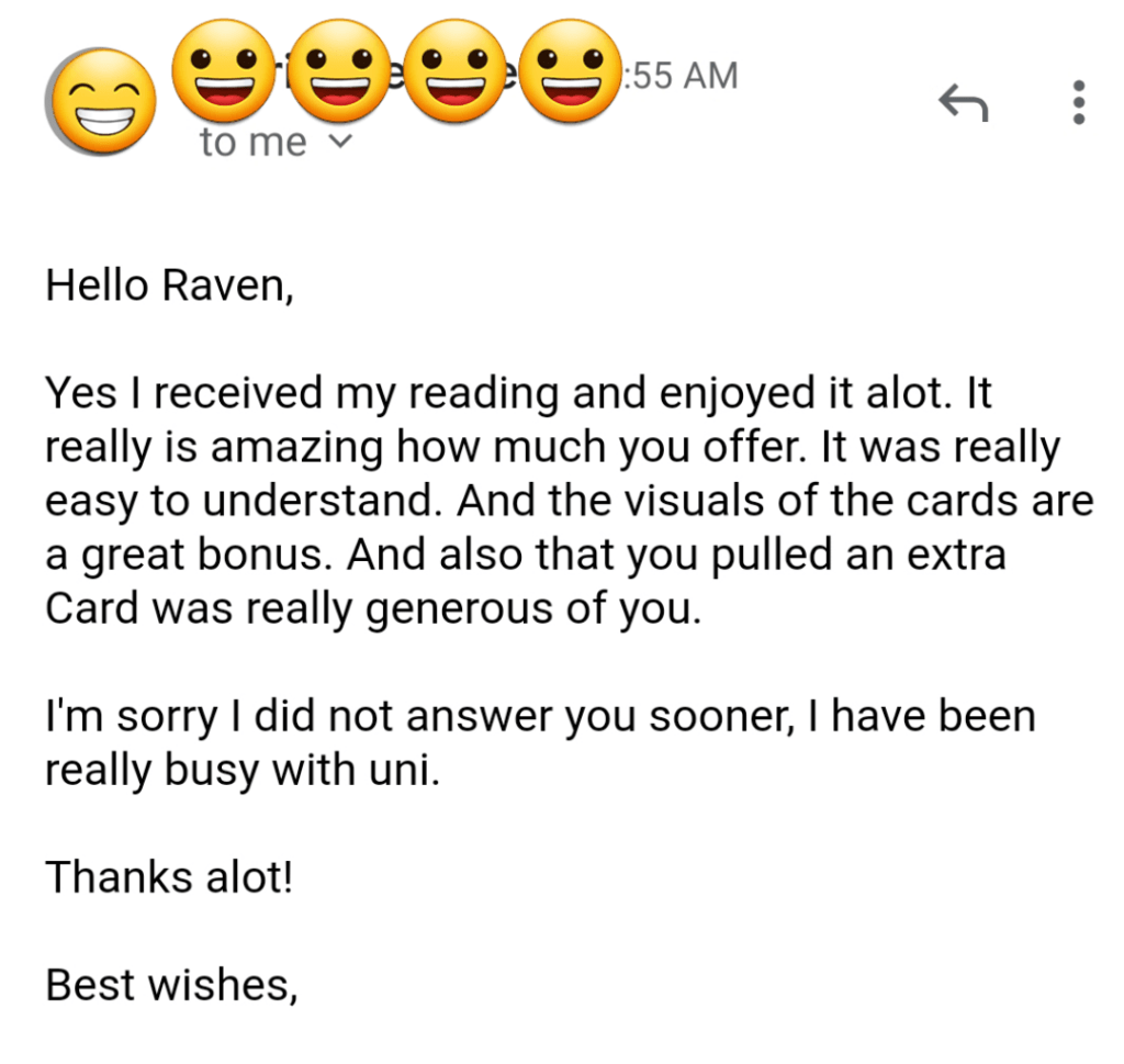 Thank you for your very intuitive reading. I will concentrate on keeping my creativity to one idea at a time. All aspects of the reading was on point!